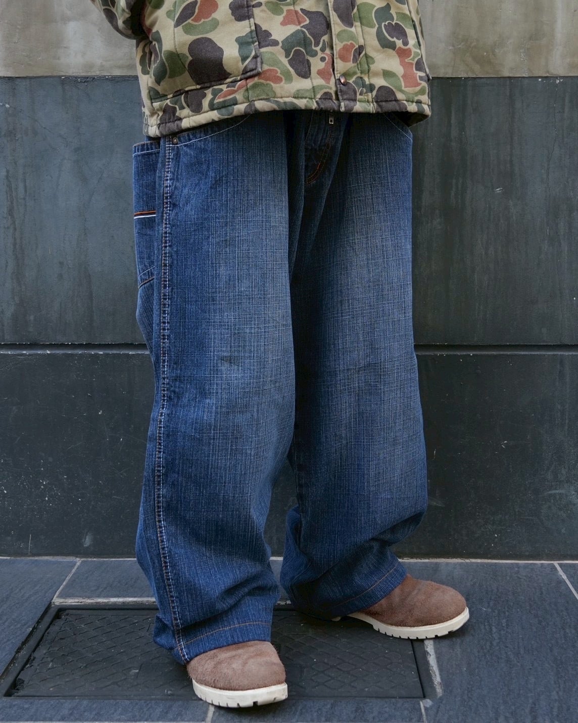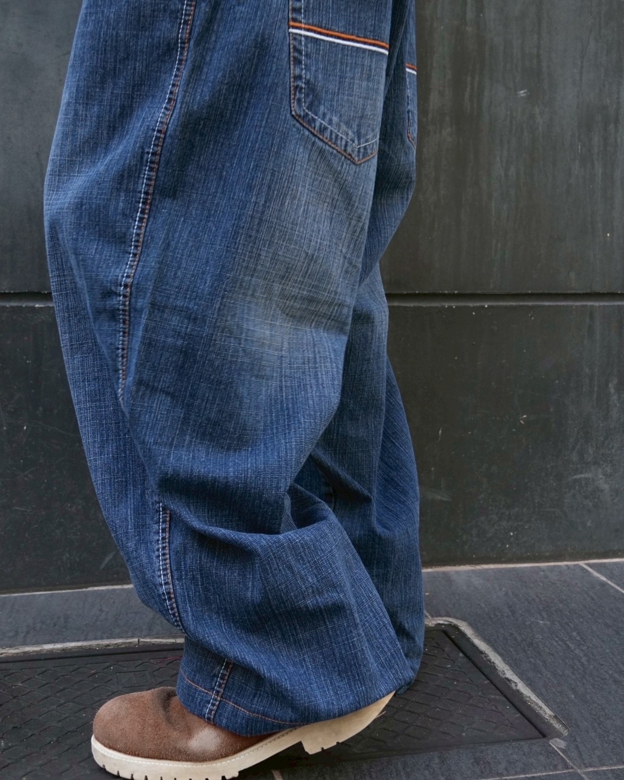 さりげないバックポケットの刺繍と全体のステッチが、オレンジと白の2色っていうのがやりすぎてなくて良いね。