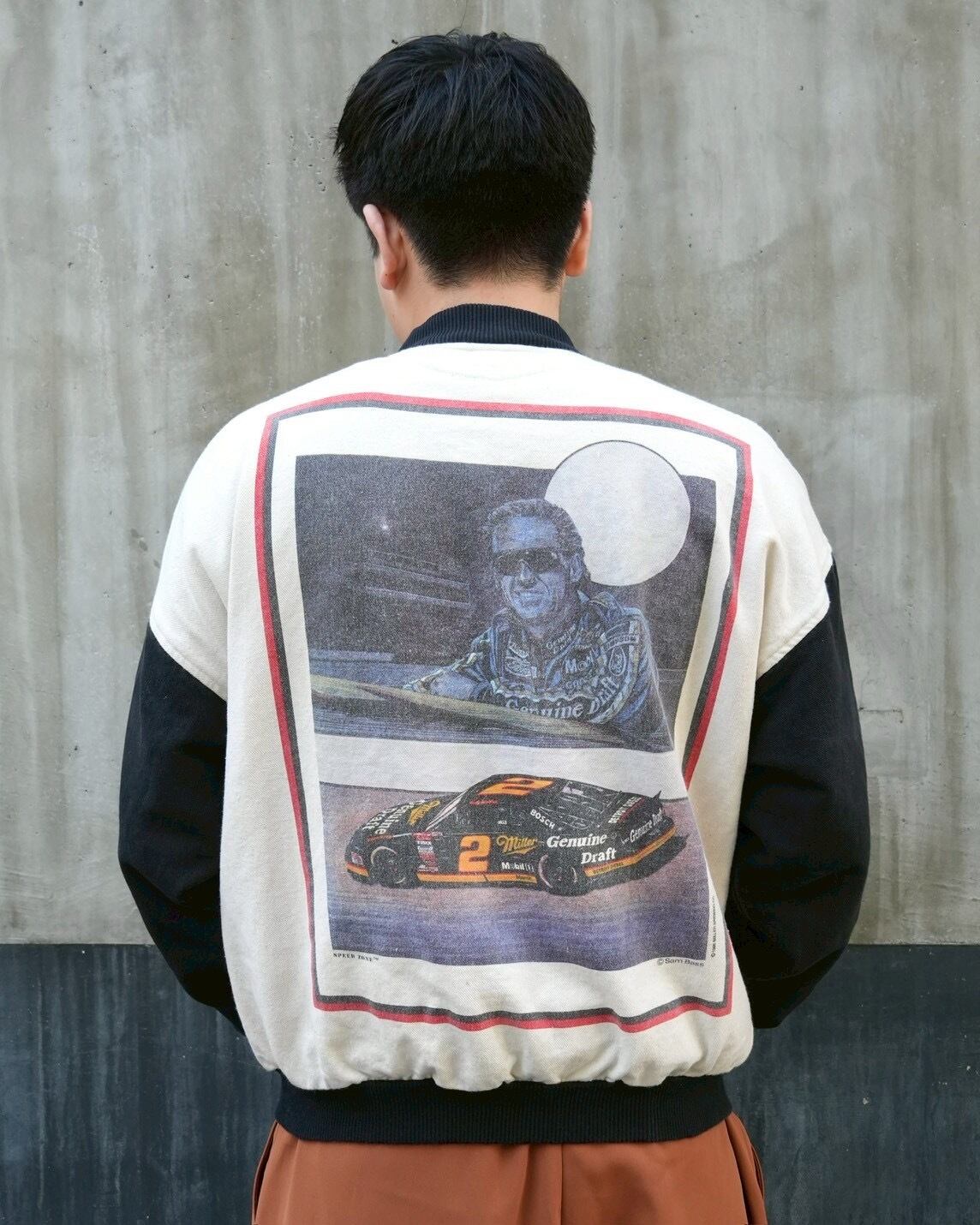 バックに大胆なレーシンググラフィックを落とし込んだ、インパクト抜群のコットンスタジャン。