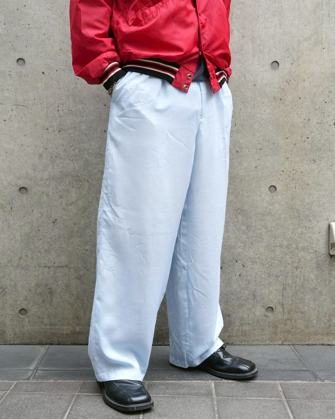 淡いライトブルーに、レーヨンポリ混紡とこっからの時期間違いないスラックス。