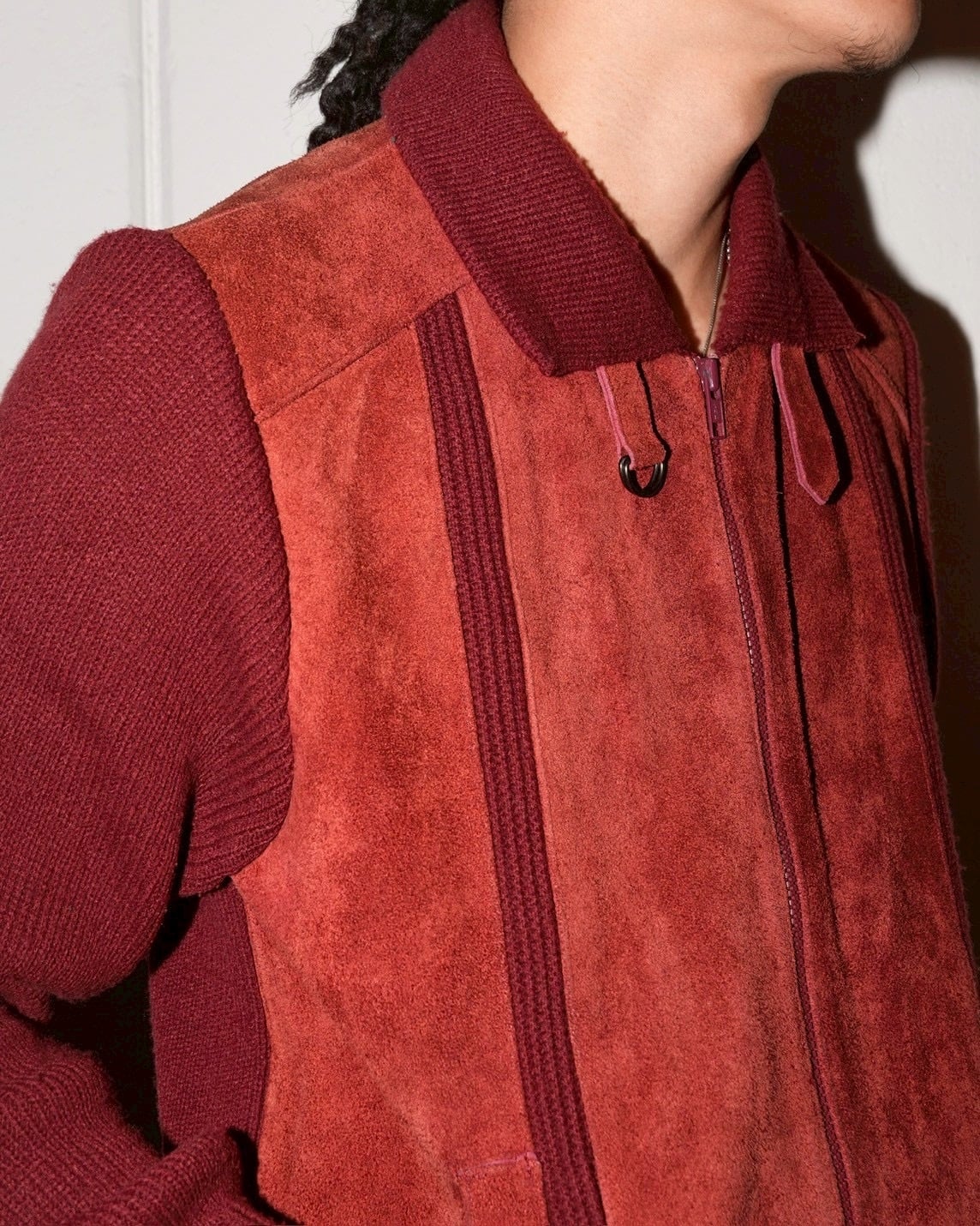 スウェード切り替えニットジャケット。